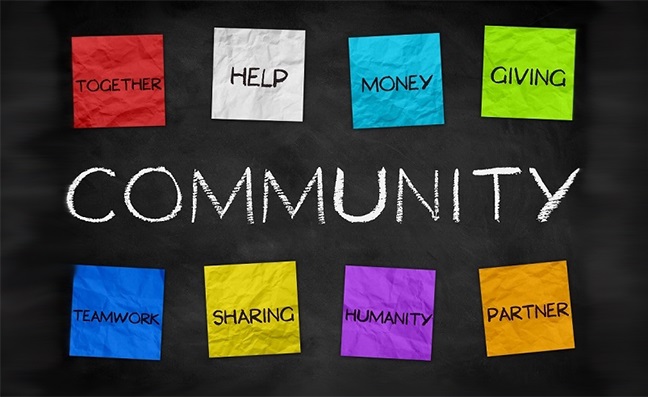 Blackboard with Community written on it has various colors of post-it notes spelling together, help, money, giving, teamwork, sharing, humanity, & partner