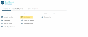 - If you suspect fraud and would like to suspend one of your cards, from the Menu; click Accounts, under Cards, click on Card Control.