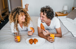 Couple eating croissants in bed in a hotel room